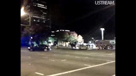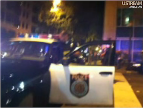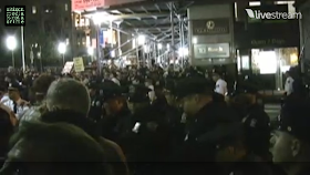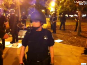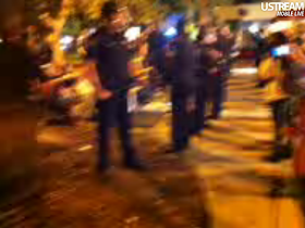 2:07AM(EST): Two protesters have been appearing to argue within the camera operator's hearing range. It's not clear what they are continuing to say, but from what I gathered one told the other to go say "arrest me" to the cop's face. Some parts of the video were dropping out. I assume they walked away, because they faded out.