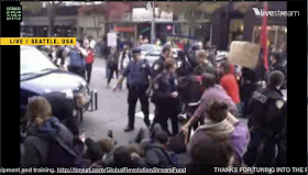 2:43AM: The protesters have taken over the homeless shelter, made a line around the blocks, and some are still at the Port. Estimated a few thousand people are protesting. Music is being played drums, and the camera operator is walking around. One SWAT van, many riot officers, and more.