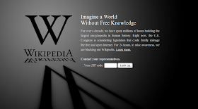 Wikipedia. A digital user-based encyclopedia. A free one at that. Used by millions, and edited by millions. Wikipedia serves pages about history, and current events, ranging multiple subjects. While they didn't pick out bits of the website to be blacked, they did lay-over a big notice. SOPA would be in huge conflict with the linkage.
